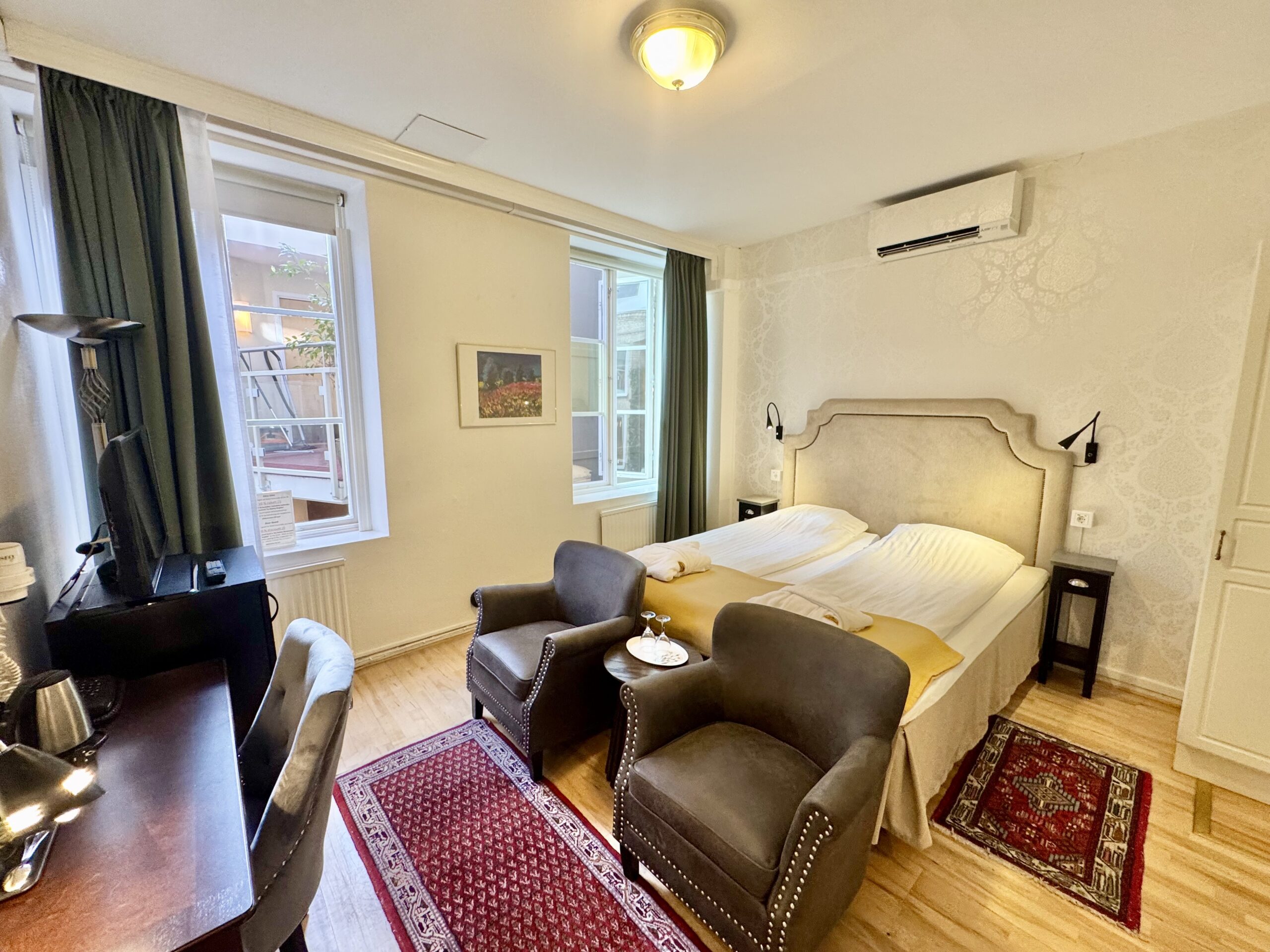 Bo bekvämt i vårt elegant inredda Enkelrum, och njut av en personlig och charmig miljö med utsikt mot staden. Här kombineras historisk atmosfär med modern komfort, och flera rum erbjuder även AC för en ännu mer behaglig vistelse.