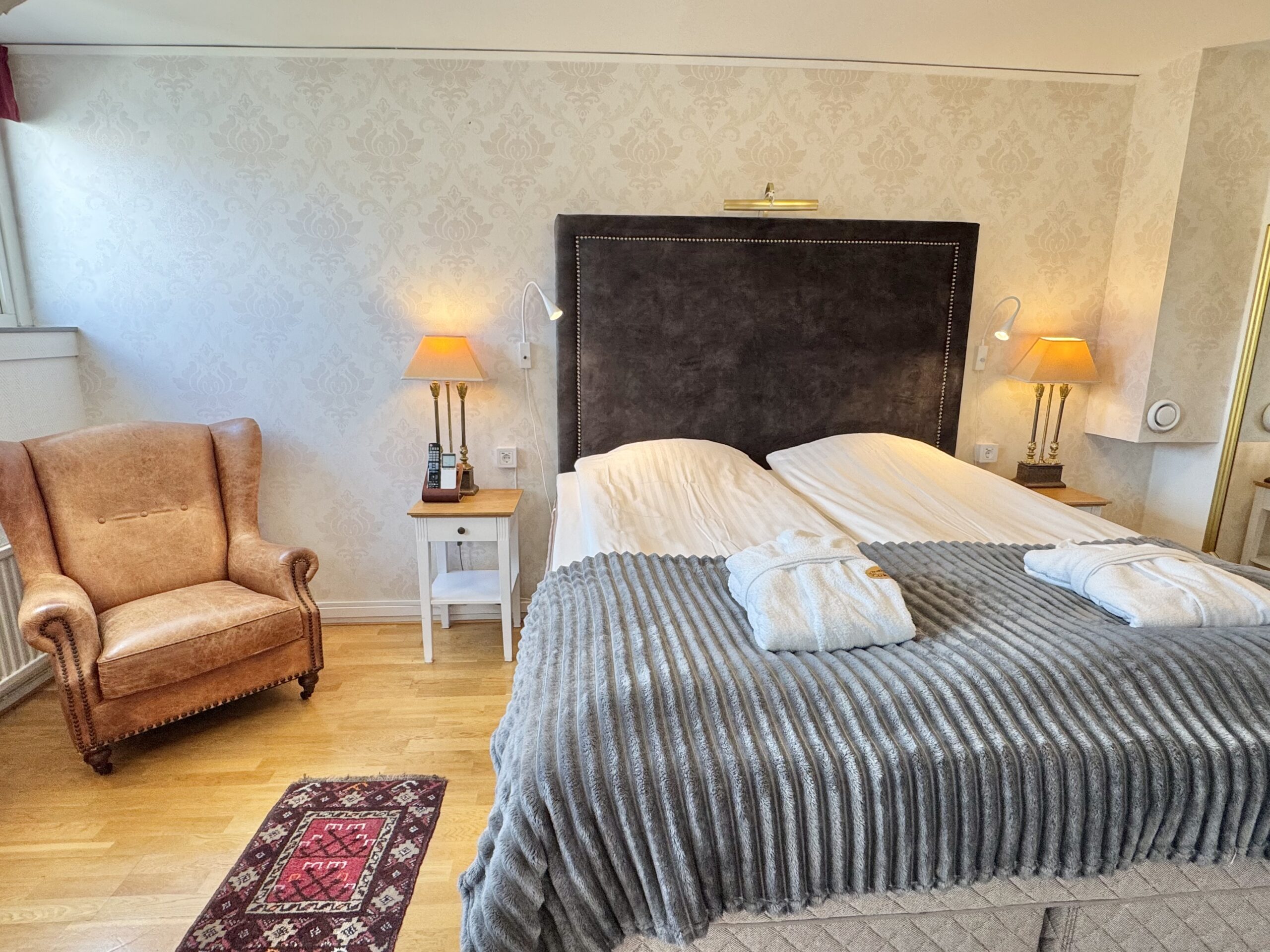 Upplev hög komfort och avkoppling i våra dubbelrum grandlit ekonomi på 15 kvm. Med en 140 cm bred säng och en inredning som kombinerar klassisk känsla med moderna bekvämligheter, ger rummet en avslappnad och behaglig atmosfär.