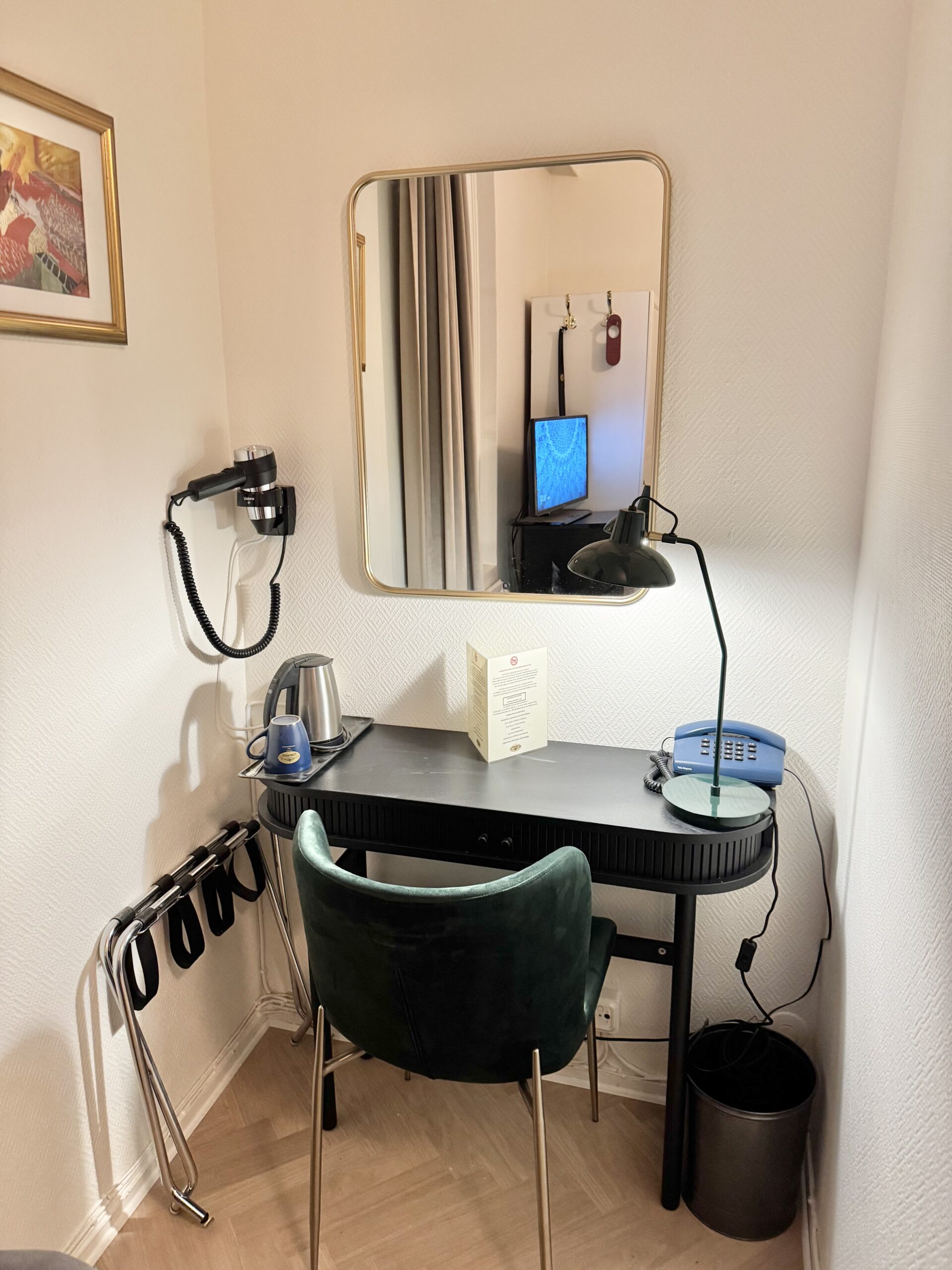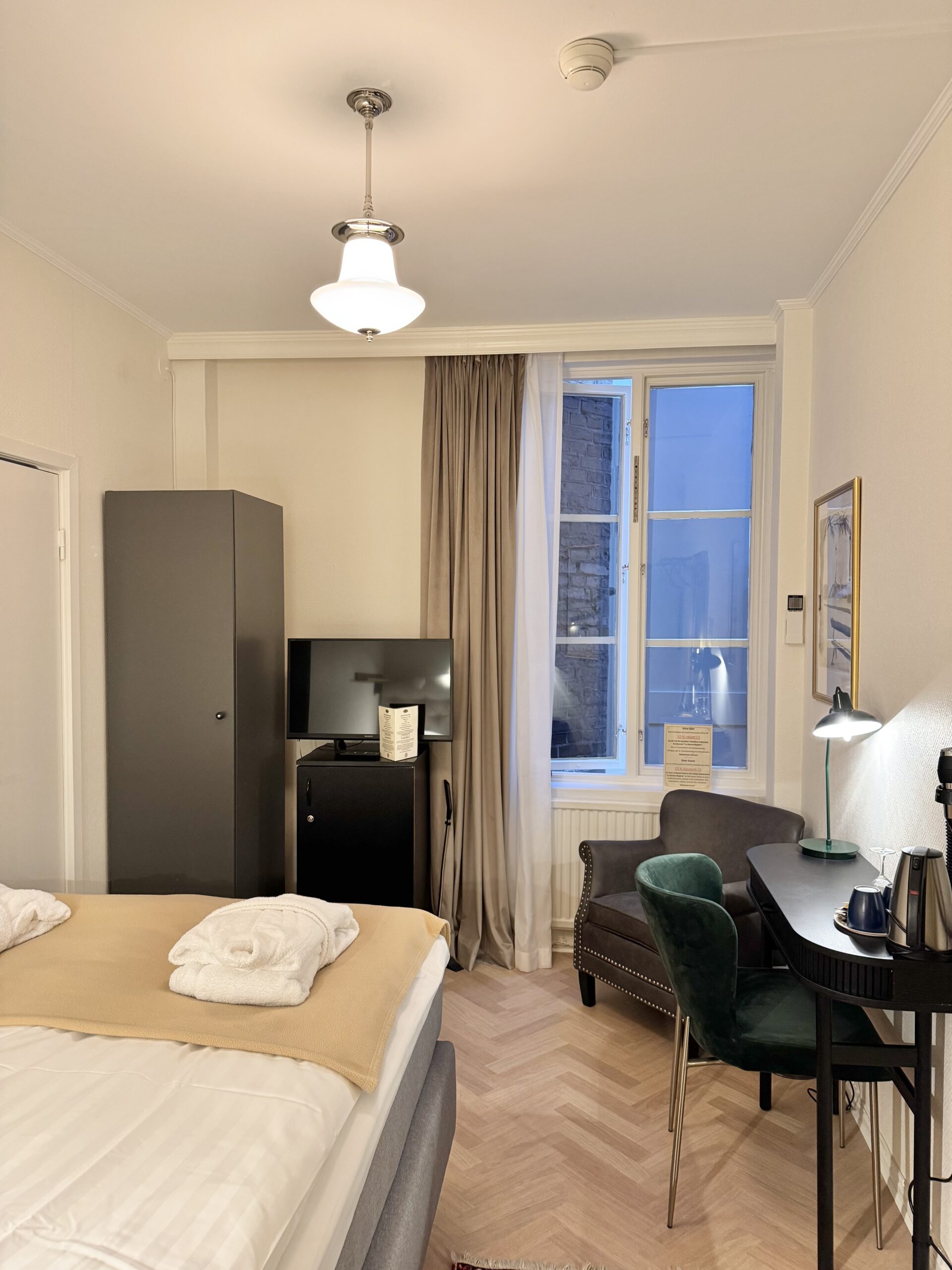 Upplev hög komfort och avkoppling i våra dubbelrum grandlit ekonomi på ca 15 kvm. Med en 140 cm bred säng och en inredning som kombinerar klassisk känsla med moderna bekvämligheter, ger rummet en avslappnad och behaglig atmosfär.